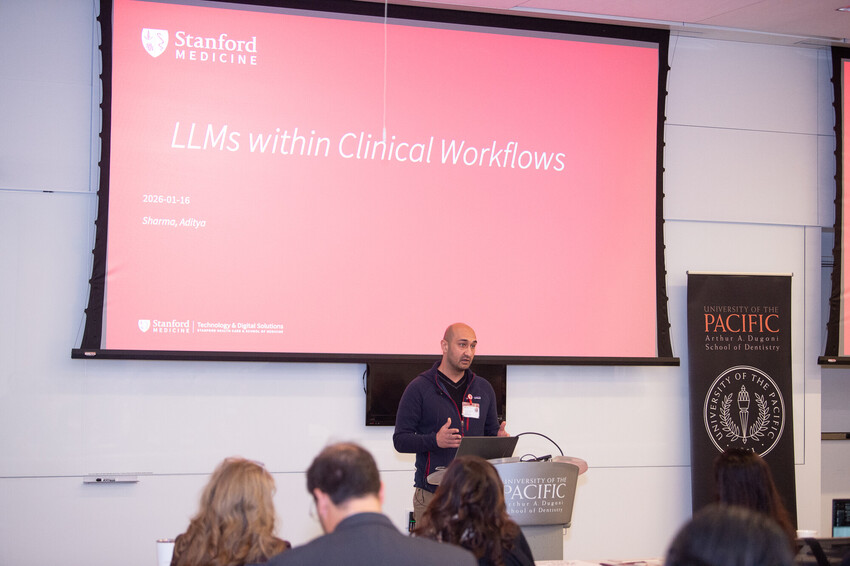 Co-hosted by the Dugoni School’s Center for Innovation and Translation and the Pacific Center for Equity in Oral Health Care, the event brought together leaders from Hippocratic AI, 2-Sigma AI, PathAI, OraQ, Overjet, VELMENI, Stanford Health Care and Stanford Arise, along with faculty experts from the Dugoni School of Dentistry. The symposium focused on how AI can responsibly advance patient care, research, education and access across oral health care and the broader health care ecosystem.
